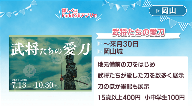 岡山県の1位は、岡山城で開かれている展示会「武将たちの愛刀」です。地元備前の刀をはじめ、武将たちが愛した刀を数多く展示しています。武器であり権威の象徴でもある刀を通して、所有者の人間性などを感じ取ることができるかもしれません。期間は10月30日まです。