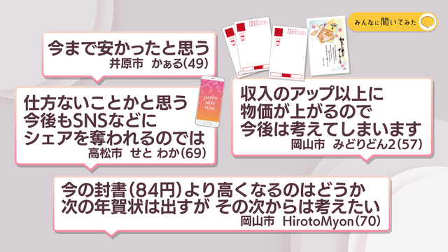 新年の年賀状送る?【みんなに聞いてみた】 2024/9/30 17:30 みんなに聞いてみた ADVERTISEMENT ADVERTISEMENT 30日は10月1日に値上がりする郵便料金についてお伝えしました。Park KSBアプリでは「年賀はがきが値上がりする中、新年の年賀状を出すか」聞いてみました。 写真ページをみる