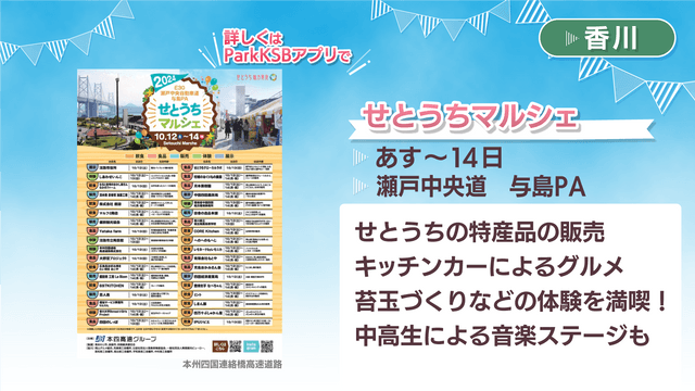 香川県の1位は、与島パーキングエリアで開かれる「せとうちマルシェ」です。せとうちの特産品の販売や、キッチンカーによるグルメを楽しめるほか、苔玉づくりや焼き物の絵付けなどの体験もできます。また地元の中高生による音楽ステージもあるということです。せとうちの「おいしい」「楽しい」が目白押しのイベントです!