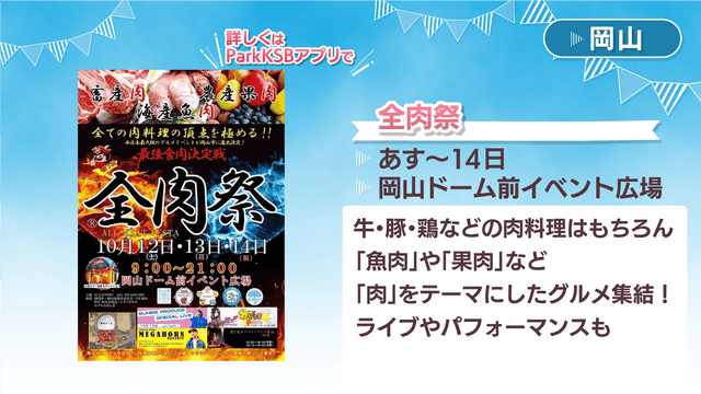 岡山県の3位は、岡山ドーム前のイベント広場で12日からの3連休開かれる「全肉祭」です。牛・豚・鶏などの肉料理はもちろん、「魚肉」や「果肉」など「肉」をテーマにしたグルメが全国各地から集まります。アーティストのライブやパフォーマンスステージも楽しめます。当日は込み合うことが予想されているため、公共交通機関の利用がおすすめです。