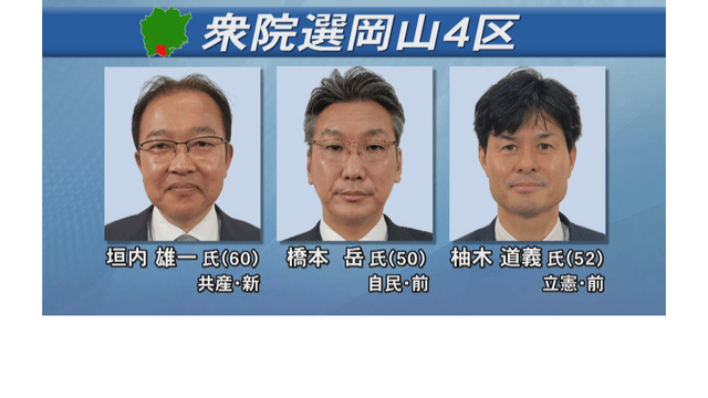 岡山4区は届け出順に、共産党新人の垣内雄一さん(60)、自民党前職の橋本岳さん(50)、立憲民主党前職の柚木道義(52)さんの3人が立候補。10年前の衆院選と同じ顔ぶれとなりました。