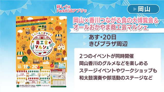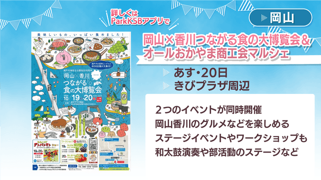 岡山県の1位は岡山県吉備中央町のきびプラザ周辺で19日と20日開かれる「岡山×香川つながる食の大博覧会」と、「オールおかやま商工会マルシェ」です。食の大博覧会では、岡山と香川から約50の店が大集合! 地元のグルメを楽しめます。商工会マルシェは岡山県の20の商工会が連携して開くもので、岡山県のグルメや特産品が集まります。このほか和太鼓の演奏や県内の中学校や高校の部活動によるステージイベントなども楽しむことができます。