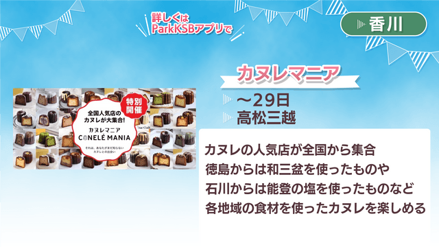 香川県の1位は、高松三越で開かれている「カヌレマニア」です。カヌレの人気店が全国から集まっているため、プレーンだけでなく、徳島からは和三盆を使ったものや、石川からは能登の塩を使ったものなど、各地域の食材を使ったカヌレを楽しむことができます。このイベントは10月29日まで高松三越で開かれています。