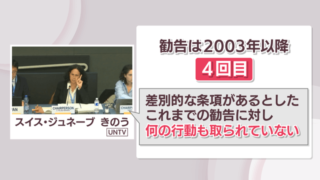 勧告は2003年以降4回目で、「差別的な条項があるとしたこれまでの勧告に対し、何の行動も取られていない」と指摘しています。