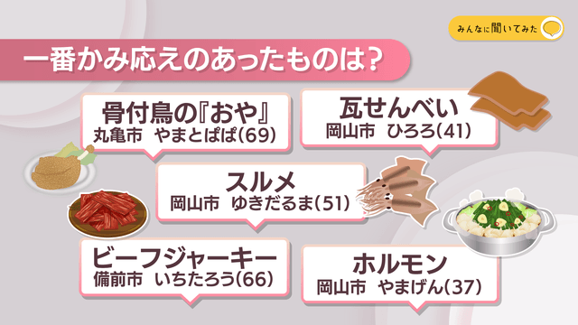 かみ応えのある食べ物は好き?【みんなに聞いてみた】 2024/11/8 17:30 みんなに聞いてみた ADVERTISEMENT ADVERTISEMENT 8日は、石のようにかたい食感の善通寺市の「カタパン」をご紹介しました。Park KSBアプリでかみ応えのある食べ物が好きかどうか聞いてみました。 写真ページをみる