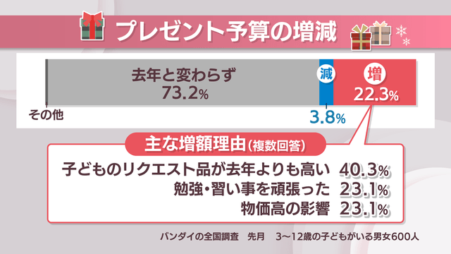 バンダイのアンケート調査によるとプレゼントの予算を2023年より増やした人は22.3%。理由については「子どものリクエスト品が2023年よりも高い」が約4割、次いで「勉強・習い事を頑張った」と「物価高の影響を受けて」がいずれも2割ほどとなりました。