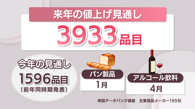 さて、この値上げの動きはいつまで続くのでしょうか? 帝国データバンクの主要食品メーカー195社への調査によると、2025年値上げが見込まれているのはパン製品やアルコール飲料など3933品目でした。