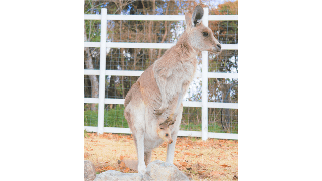 赤磐市のテーマパークでカンガルーの赤ちゃんが生まれ、お母さんのおなかのポケットから可愛らしい顔をのぞかせています。