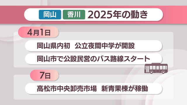 そして、4月は新たなスタートが目白押しです。岡山市では県内初の「公立夜間中学」や「新たなバス路線」が開設。高松市の市場も移転します。