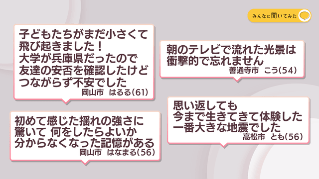 阪神淡路大震災知ってる?発災日は?【みんなに聞いてみた】 2025/1/14 17:30 みんなに聞いてみた ADVERTISEMENT ADVERTISEMENT 14日はまもなく30年となる阪神淡路大震災に関するニュースをお伝えしました。Park KSBアプリでは、みなさんに阪神淡路大震災を知っているか聞いてみました。 写真ページをみる