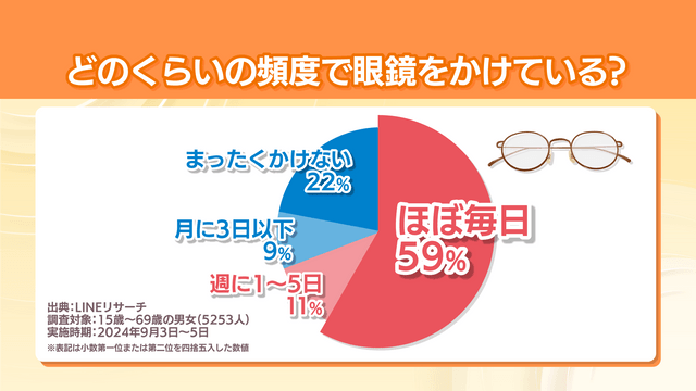 2024年9月、LINEリサーチが10代~60代の男女を対象に行った、眼鏡をかける頻度についてのアンケートによると、ほぼ毎日かける人は、全体の約6割。頻度に関わらなければ、8割弱の方が眼鏡ユーザーという結果になりました。