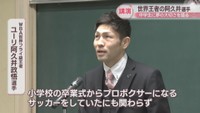 赤磐市立赤坂中学校の立志式で記念講演を行ったユーリ阿久井政悟選手