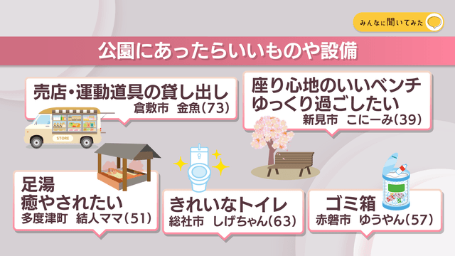 公園にどのくらいの頻度で行きますか?【みんなに聞いてみた】 2025/2/12 17:30 みんなに聞いてみた ADVERTISEMENT ADVERTISEMENT 12日は高松市中央公園の再整備のニュースをお伝えしましたが、Park KSBアプリではみなさんに「公園」について聞いてみました。 写真ページをみる