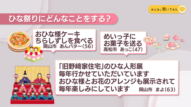 ひな人形を飾る?【みんなに聞いてみた】 2025/2/27 17:30 みんなに聞いてみた ADVERTISEMENT ADVERTISEMENT 27日は、東かがわ市で3月3日まで開かれる「引田ひなまつり」についてお伝えしました。Park KSBアプリでは、皆さんに「ひな人形」を飾るか聞いてみました。 写真ページをみる