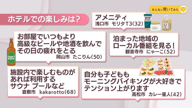 ホテルを選ぶときに重視するポイントは?【みんなに聞いてみた】 2025/3/12 17:30 みんなに聞いてみた ADVERTISEMENT ADVERTISEMENT 12日はJR高松駅の近くに新たなホテルがオープンしたニュースをお伝えしました。Park KSBアプリではみなさんが「ホテルを選ぶ時に重視するポイント」を聞いてみました。 写真ページをみる