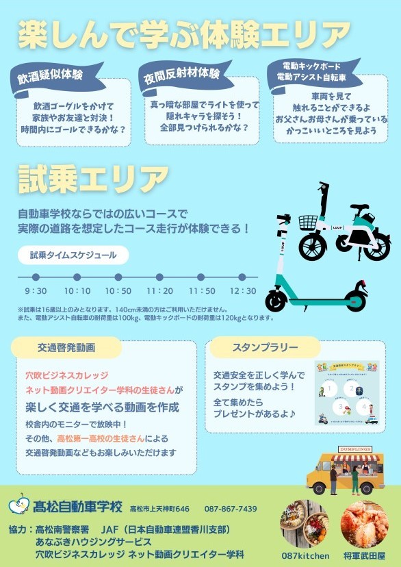 地域ぐるみで交通安全を推進します。高松自動車学校(高松市上天神町)が21日午前9時半~午後1時半、交通啓発イベント「楽しんで学ぶ 交通安全フェスタ」を開催します。入場無料、参加自由、雨天決行。