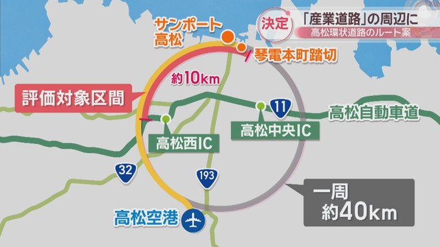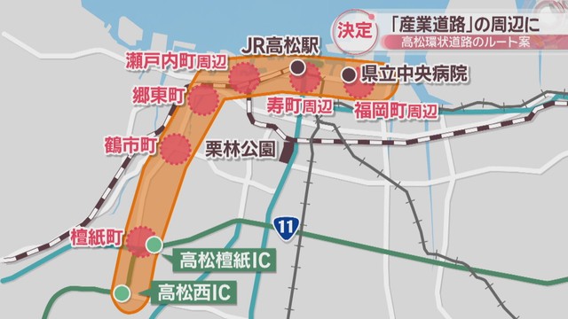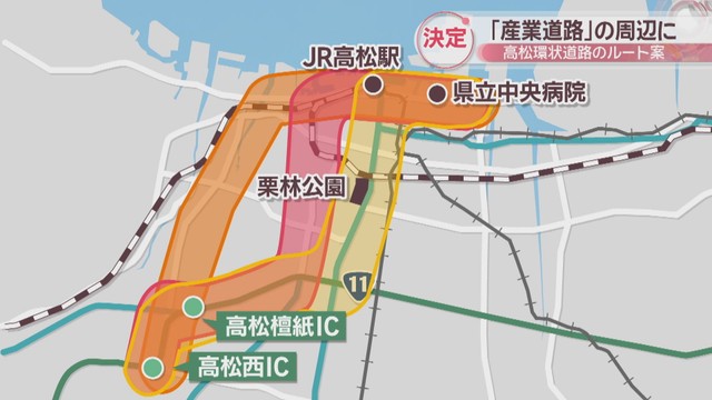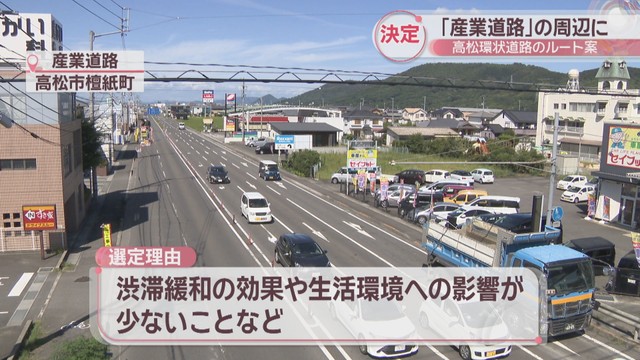 国が事業化を目指している高規格道路、高松環状道路のルートについて、国土交通省は3つの案から産業道路の周辺を通るルートに決めました。