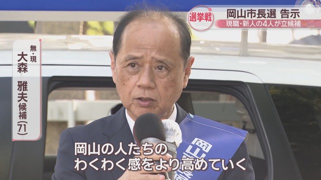 立候補したのは、届け出順に、4回目の当選を目指す現職の大森雅夫さん(71)、新人で市民団体役員の向谷千鳥さん(67)、新人で元警察官の神崎政人さん(37)、新人で元岡山市議会議長の浦上雅彦さん(60)の4人で、いずれも無所属です。