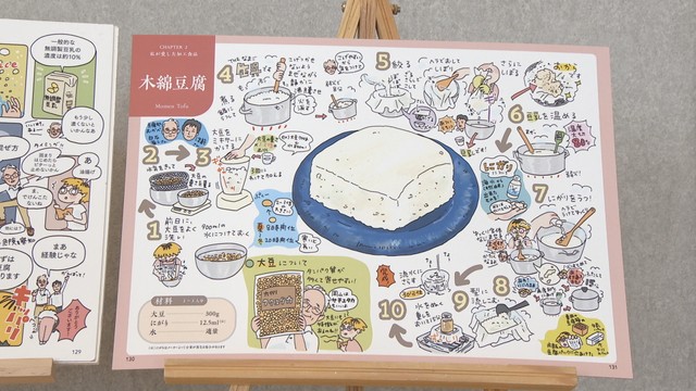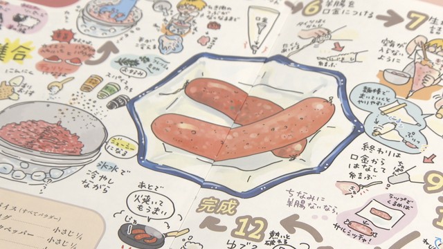 ソーセージや豆腐など、浜竹さんが実際に手作りした様々な食べ物のレシピをユニークなイラストで表現しています。
