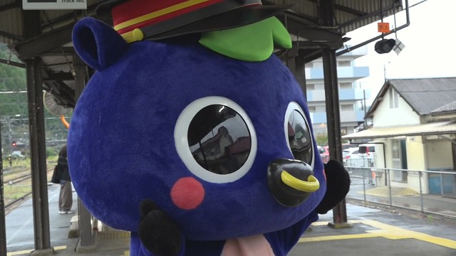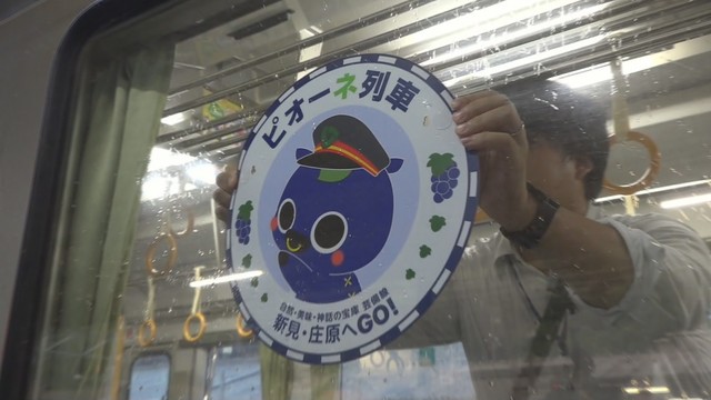 そして、新見市のマスコットキャラクター「にーみん」が出迎える中、乗客にピオーネが配られ、さっそく列車の中で味わいました。