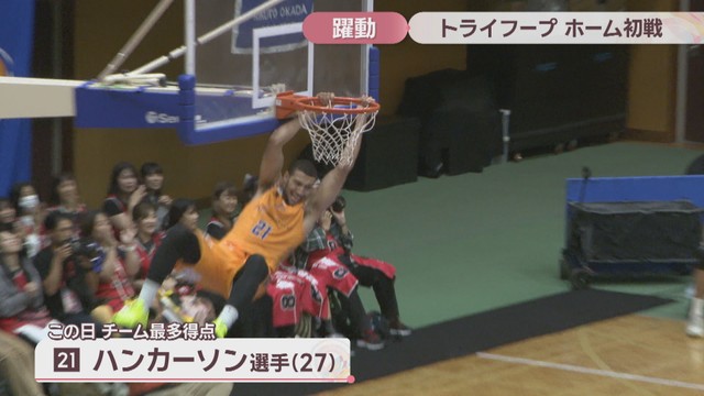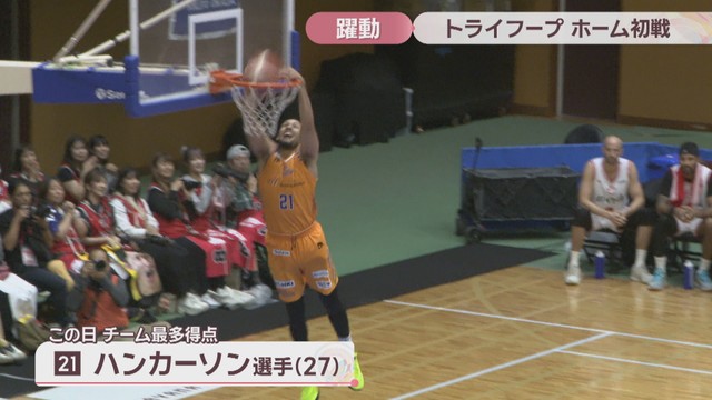 ダンクシュートを決めるハンカーソン選手 津山総合体育館 4日