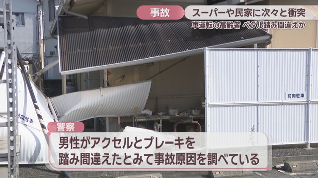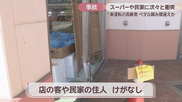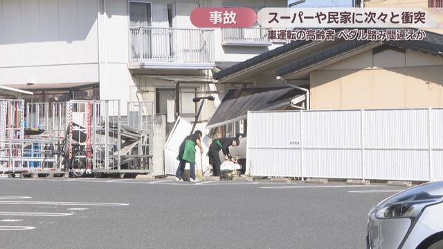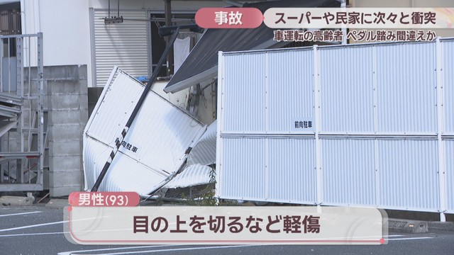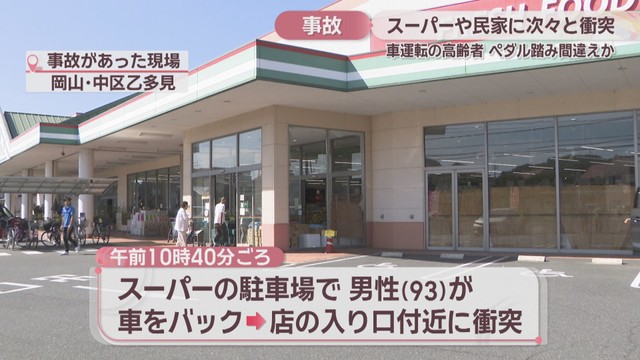 93歳運転の車が後退しスーパーに衝突…その後、40m前進し車と住宅に次々ぶつかる 運転手が軽傷 客や住人にけがなし 岡山市