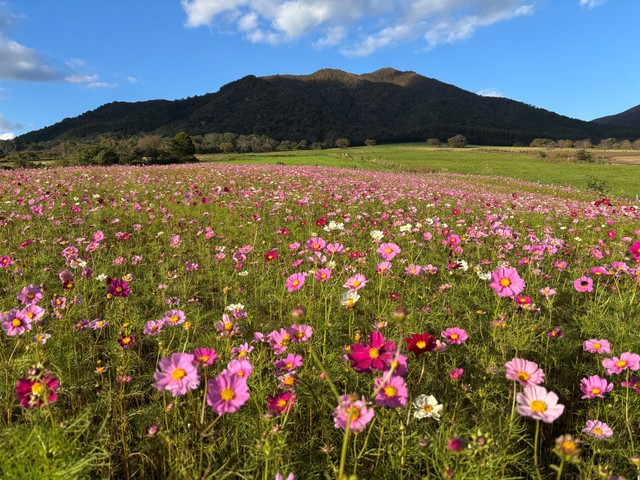 放牧地の隣にあるコスモス畑には、ピンクや白など色鮮やかな約10万本のコスモスが咲き誇っています。