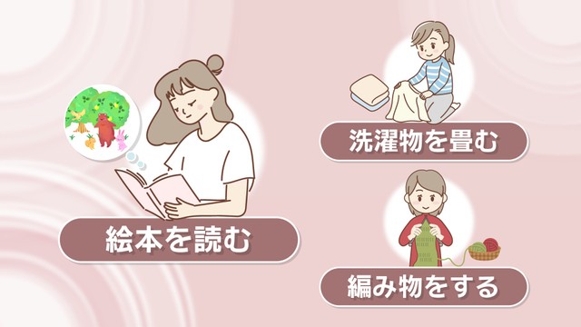 寝る前に絵本を読むこともおすすめだそうです。10分弱で読み切れるくらいの優しいストーリーなどがいいそうです。