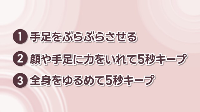 まず、手足をぶらぶらさせます。その後、顔や手足に力をいれて5秒キープします。そして全身をゆるめて5秒間キープします。これを何度か繰り返すことで体をリラックスさせて寝つきがよくなるといわれています。