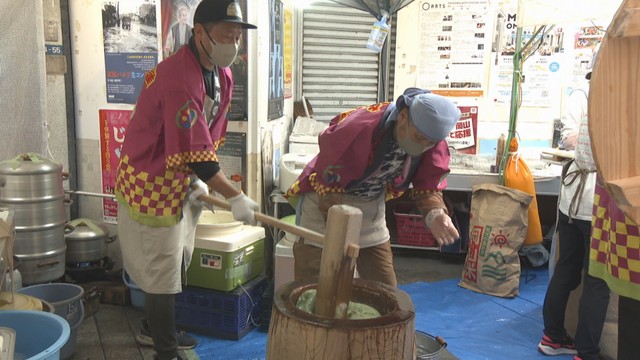 表町商店街では岡山県鏡野町の農産物や加工品を販売していて、杵でついたばかりの餅などを買い求める人でにぎわっています。