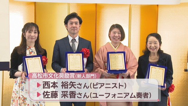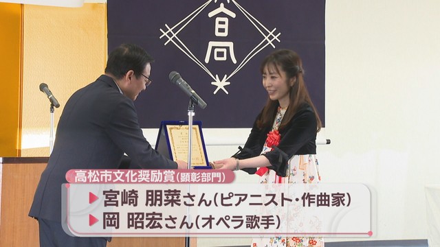 顕彰部門で受賞したのは、いずれも高松市出身でピアニスト・作曲家の宮崎朋菜さんとオペラ歌手の岡昭宏さんです。大西秀人市長からそれぞれ賞状などを受け取りました。