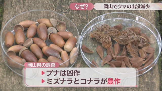 この時期のクマにとって主な食料はドングリです。岡山県の調査によると2025年、ドングリを実らせる木のうちブナは凶作でしたが、ミズナラとコナラは豊作でした。2024年はいずれも凶作だったということです。
