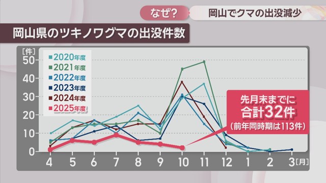 10月末までの出没件数は32件で、2024年度の同じ時期と比べて約3割にとどまっています。なぜ少ないのでしょうか?