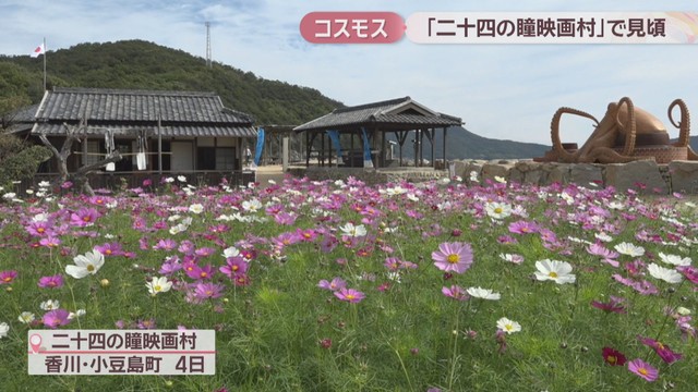 香川県小豆島の「二十四の瞳映画村」で、コスモスが見頃を迎えています。