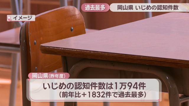 文部科学省が岡山県の全ての小中高校など636校を対象に行った調査によりますと、2024年度のいじめの認知件数は1万94件でした。前の年度より1832件増えていて過去最多です。