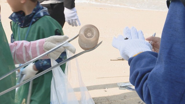 飲料メーカー大手の伊藤園が地域貢献活動の一環として2012年度から行っているもので、参加者は2つのグループに分かれて約30分ごみを拾いました。そして、拾ったごみの種類や量を記録し、どんなごみが多いか理解を深めていました。