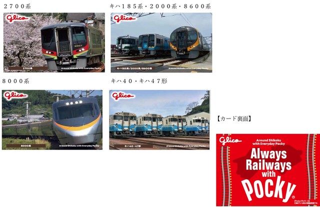オリジナルBOXのデザインは、JR四国とポッキーが共にイメージできるユニークな内容です。カードは4種類の中からランダムに1枚が入っています。