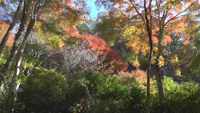 ここでは、谷沿いのもみじが色づいているだけでなく、この時季に咲く十月桜が花を咲かせています。赤色や黄色の紅葉と淡いピンクの桜を同時に楽しめるのはこの時季ならではです。