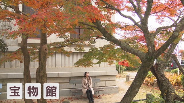 宝物館の横にはベンチがあります。座って紅葉を楽しむのにも、写真を撮るのにもよしです。