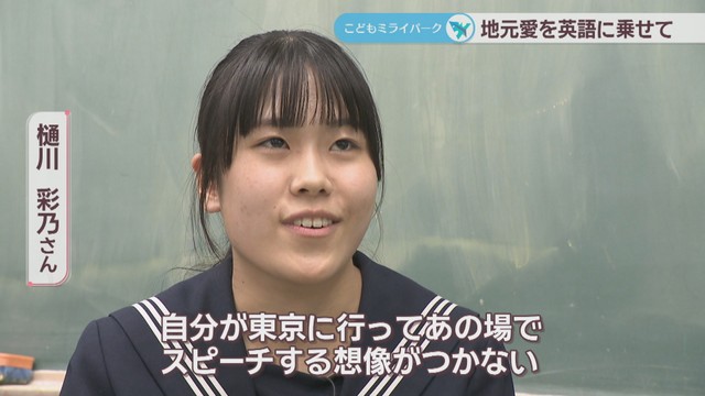 高松市立桜町中学校の3年生、樋川彩乃さんです。香川県の中学校英語弁論大会で最優秀に輝き、東京での高円宮杯に香川県代表の1人として出場します。
