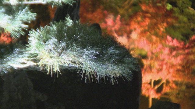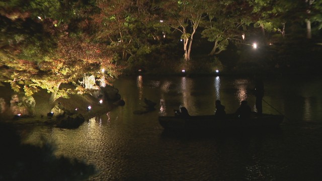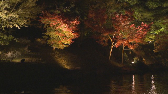 「カエデの木が下からのライトに照らされてとても綺麗に輝いています。きょうは風があって水面が揺れているんですが、風がない日は水面に反射して、絶景になるんだそうです」