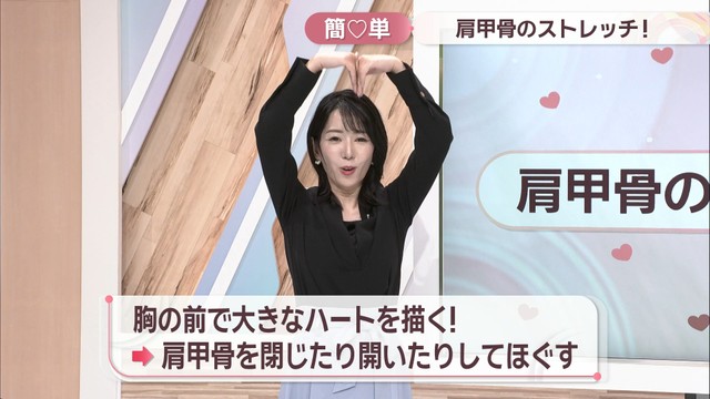 教えてもらったストレッチは、腕を胸の前で「大きなハートを描くように」動かします。意識して肩甲骨を閉じる動作と開く動作を同時に行い、筋肉をほぐすことで血行が良くなり、肩こりや首こりの改善につながるそうです!