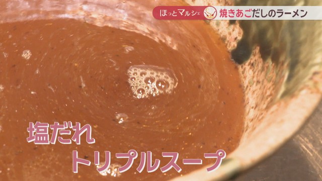「焼きあご」に数種類の魚介のだしを加えた「塩だれ」。さらに魚介に豚骨と鶏ガラを加えた「トリプルスープ」でほどよい甘味と深いコクが味わえる一杯に仕上げています。