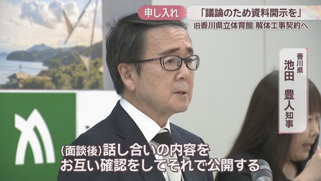 旧香川県立体育館の解体工事の請負契約を結ぶための議案が11月定例県議会に提案されています。議論するための資料を教育委員会に開示させるよう21日、県議が申し入れを行いました。