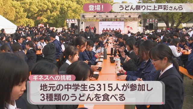 地元の中学生ら315人が参加し、いっせいに「ぶっかけうどん」「甘口トマたまカレーうどん」「醤油うどん」を食べて、食べて、食べまくります!