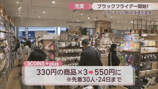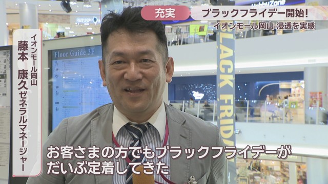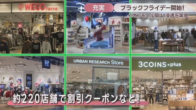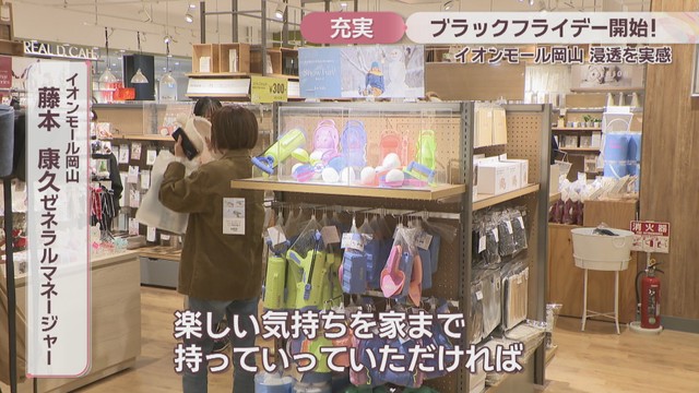 イオンモール岡山がブラックフライデーを開催するのは今回で11回目です。年末バーゲンなどの前で品揃えがよく、さまざまな商品を手に取ってほしいとしています。
