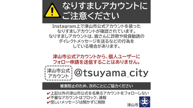市では、インスタグラムだけでなく、SNSで津山市公式アカウントが個人ユーザーをフォローすることはないとし、詐欺などの被害につながる可能性があるので、不審なアカウントはフォローせず、怪しいメッセージは削除するなどの注意を呼び掛けています。