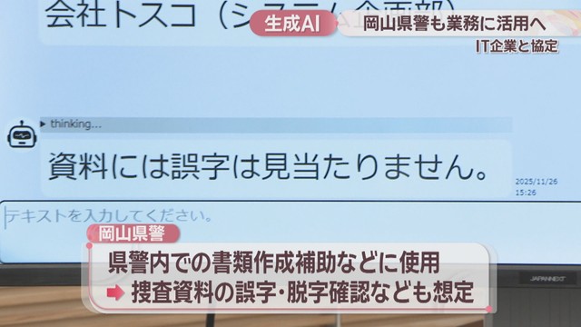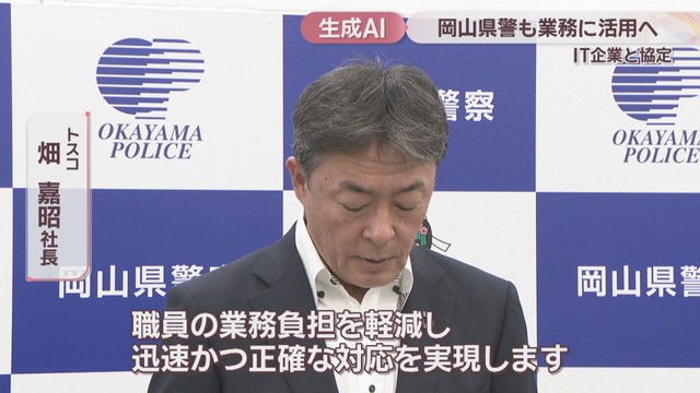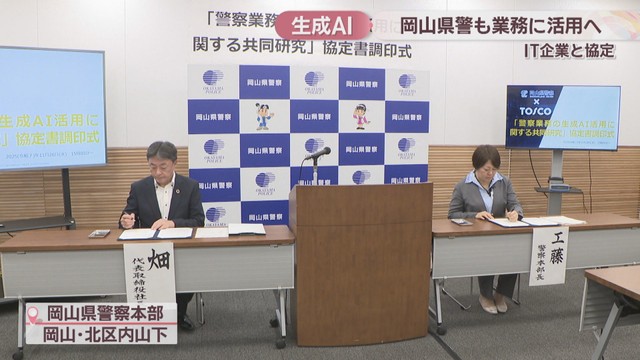 協定書にサインしたのは岡山県警の工藤陽代本部長と岡山市に本社を置くIT企業「トスコ」の畑嘉昭社長です。2者は「共同研究」として、警察の事務作業などにトスコが開発した生成AIシステムを使います。