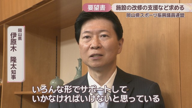 岡山県スポーツ振興議員連盟の千田博通会長が27日、スポーツの普及振興や施設の改修について岡山県の伊原木知事に支援を求める要望書を提出しました。