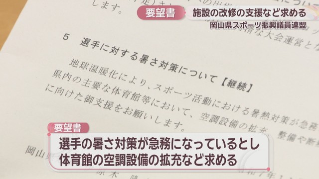 要望書では、スポーツをする上で選手の暑さ対策が急務になっているとして、主要な体育館の空調設備の拡充などを求めています。
